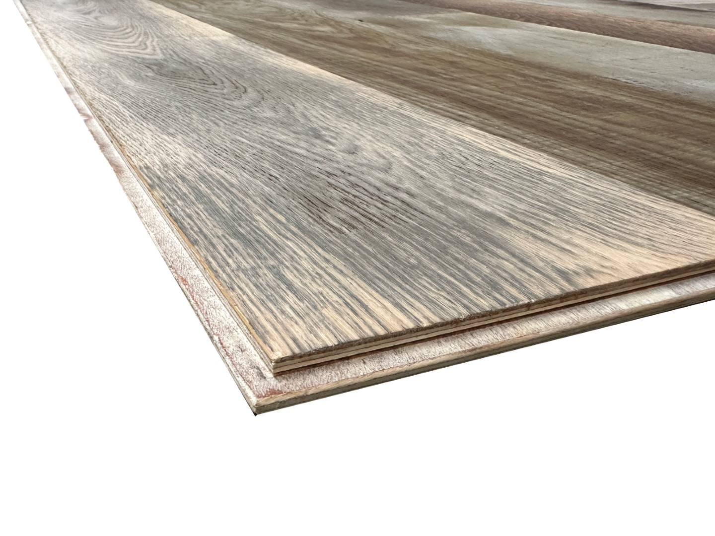 De planken hebben een dikte van 12 mm met een eiken toplaag van 3 mm, verlijmd op berkenmultiplex. Dit zorgt voor een stabiele en sterke plank. Rondom is een messing- en groefverbinding aangebracht, ook aan de kopse kanten, waardoor de planken eenvoudig te monteren zijn.