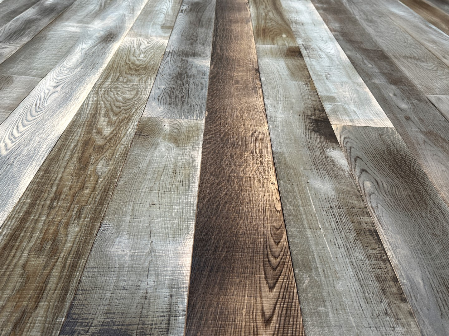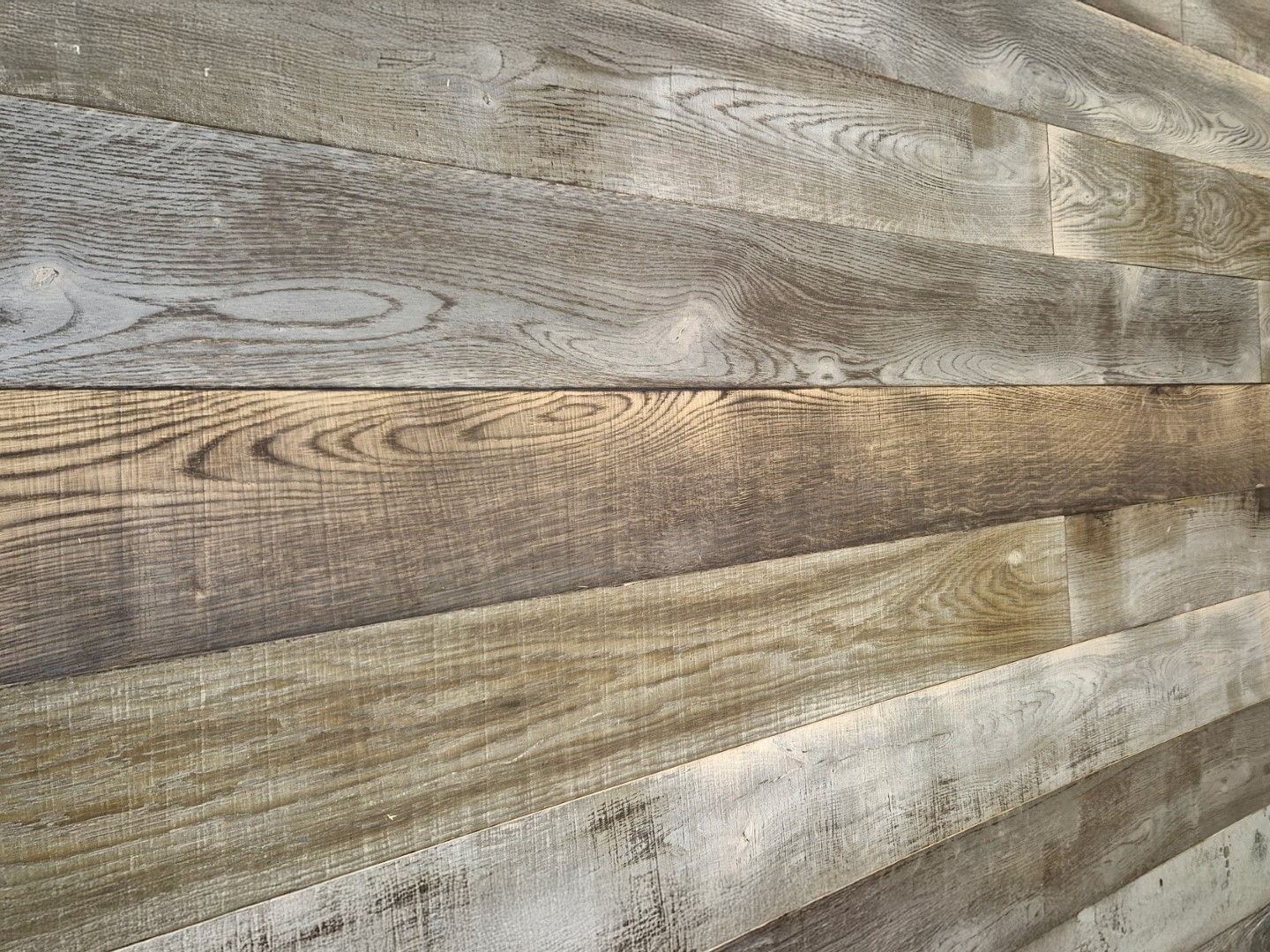 De houten planken van geborsteld/verouderd eiken hebben een unieke uitstraling en structuur. Perfect om bijvoorbeeld een wand in de woon- of slaapkamer mee te bekleden, maar ook erg mooi als plafondbekleding.