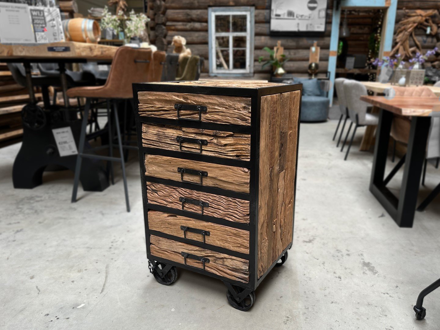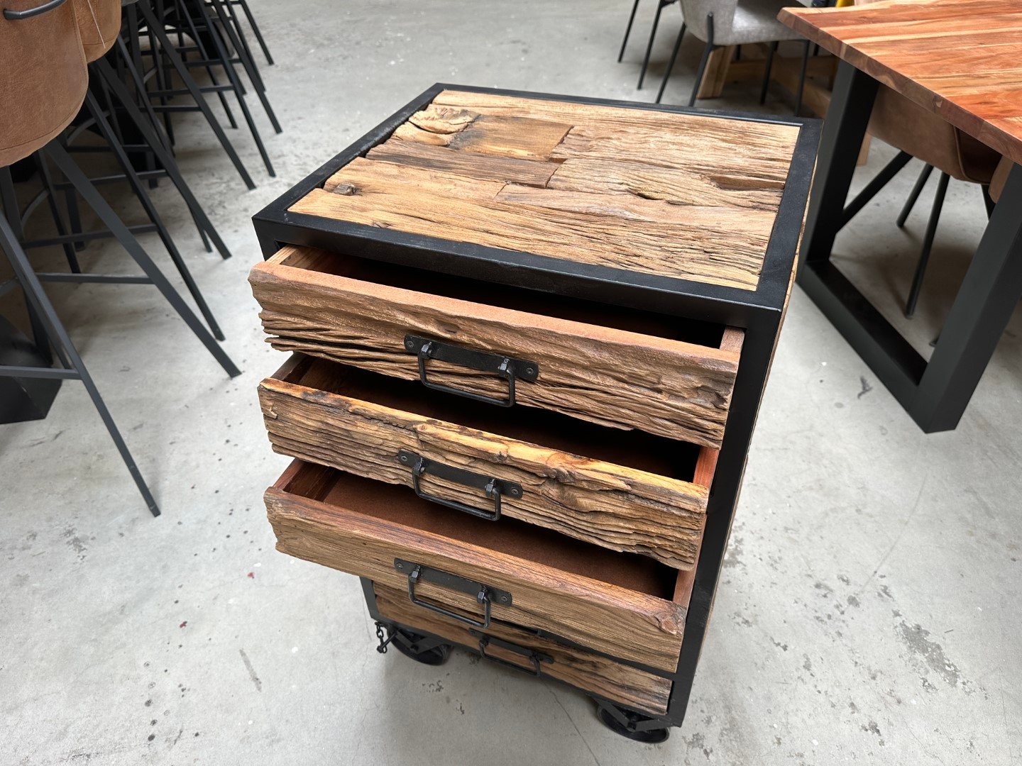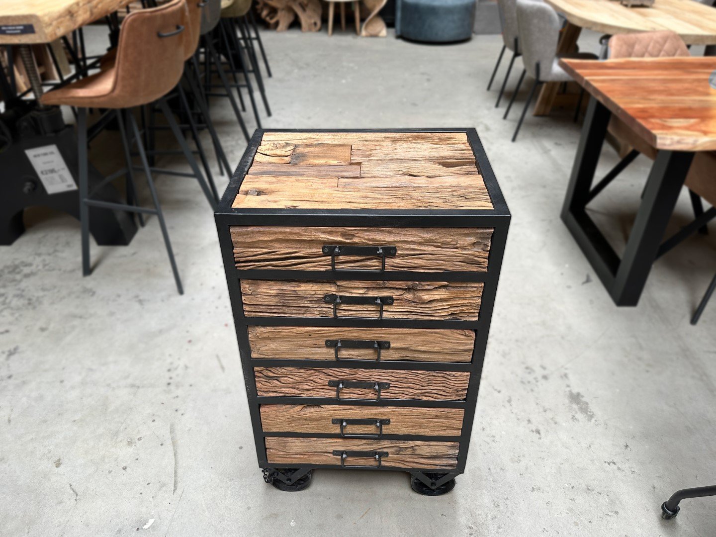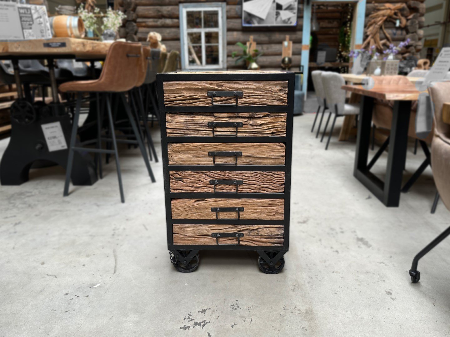 Deze prachtige ladekast van zwart metaal en het robuuste en karakteristieke sleeperwood biedt met zijn 6 laden een zee aan opbergruimte!