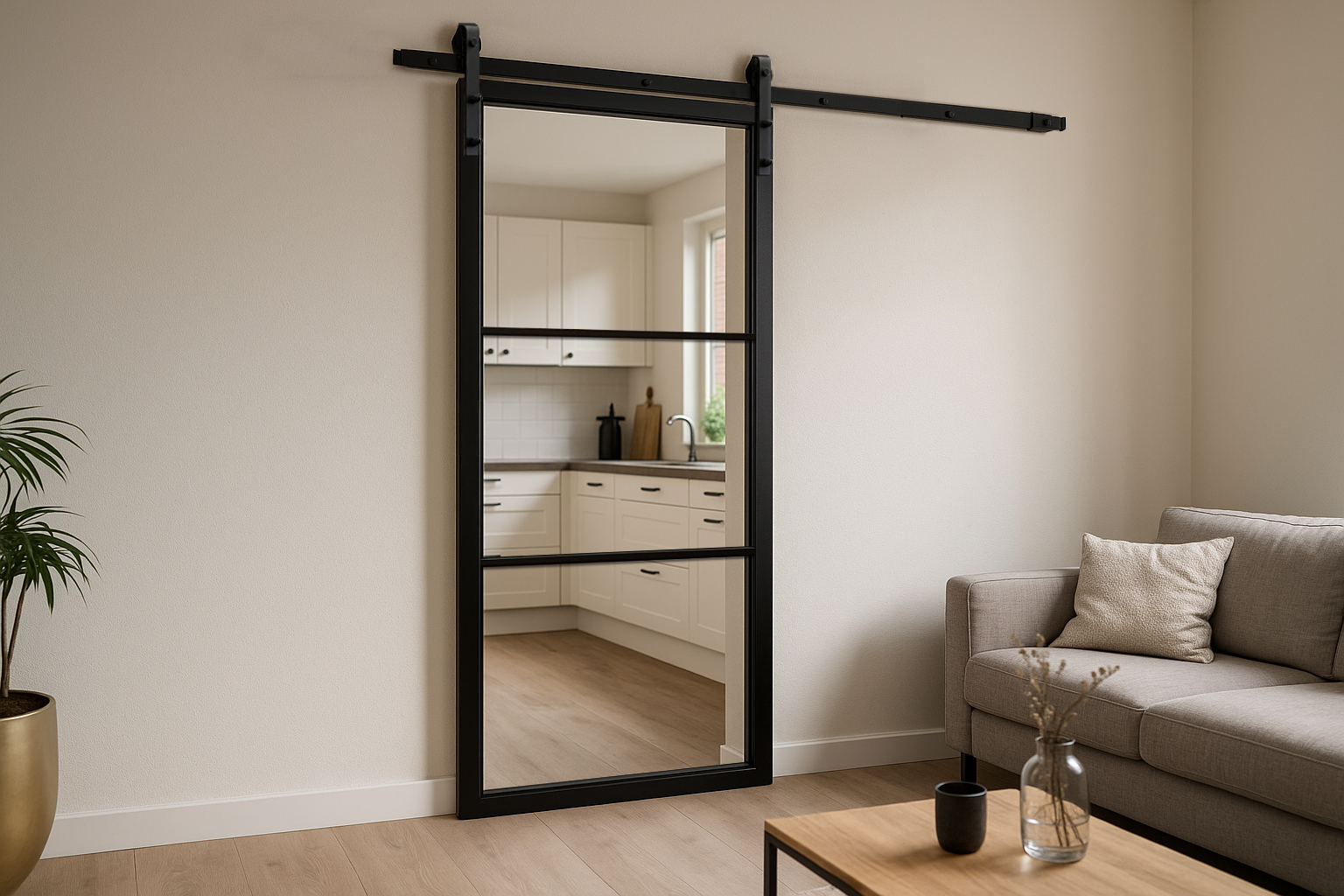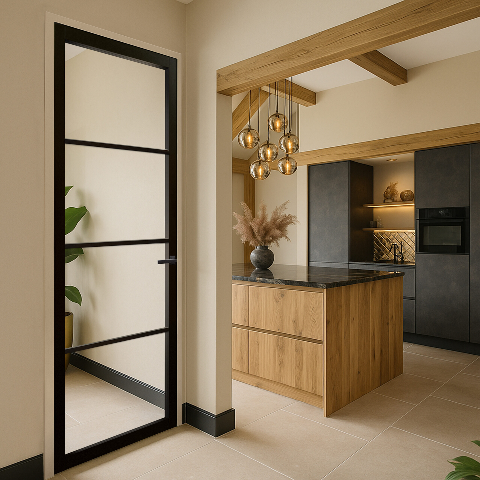 Deze staal-look binnendeur met helder glas is vergelijkbaar met modellen als de CanDo Scampton, Bradford, Carno, Retford en ook de Austria Nero Capri. Net als deze industriële deuren heeft ons model slanke stijlen en dorpels. Deze zwarte binnendeuren zijn te combineren met bijpassend zwart deurbeslag.
