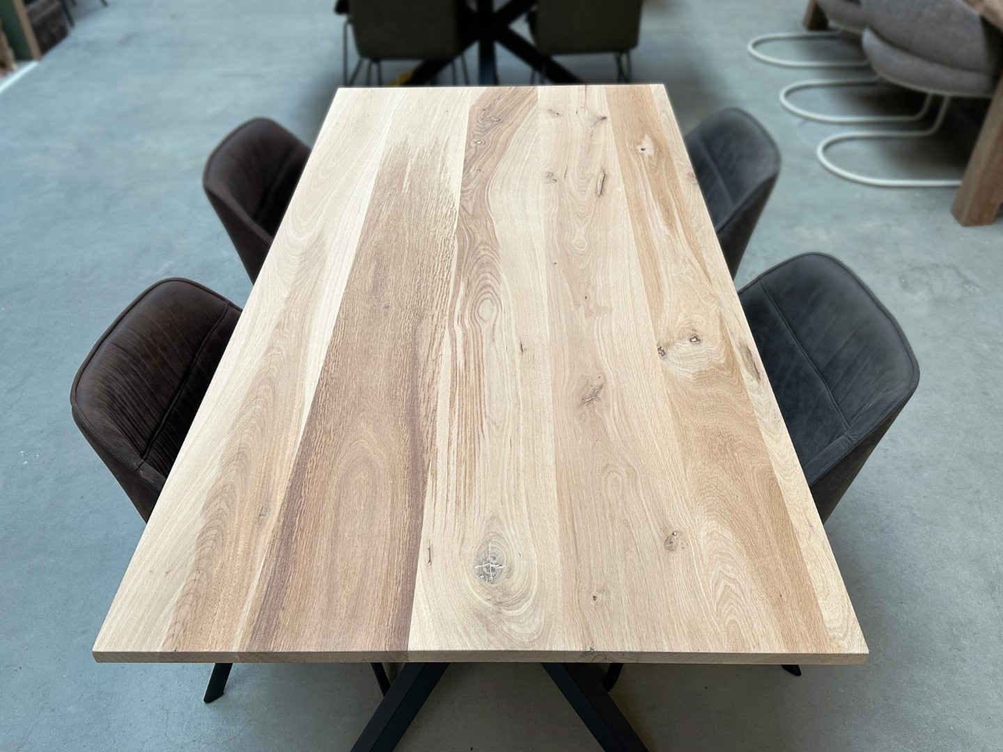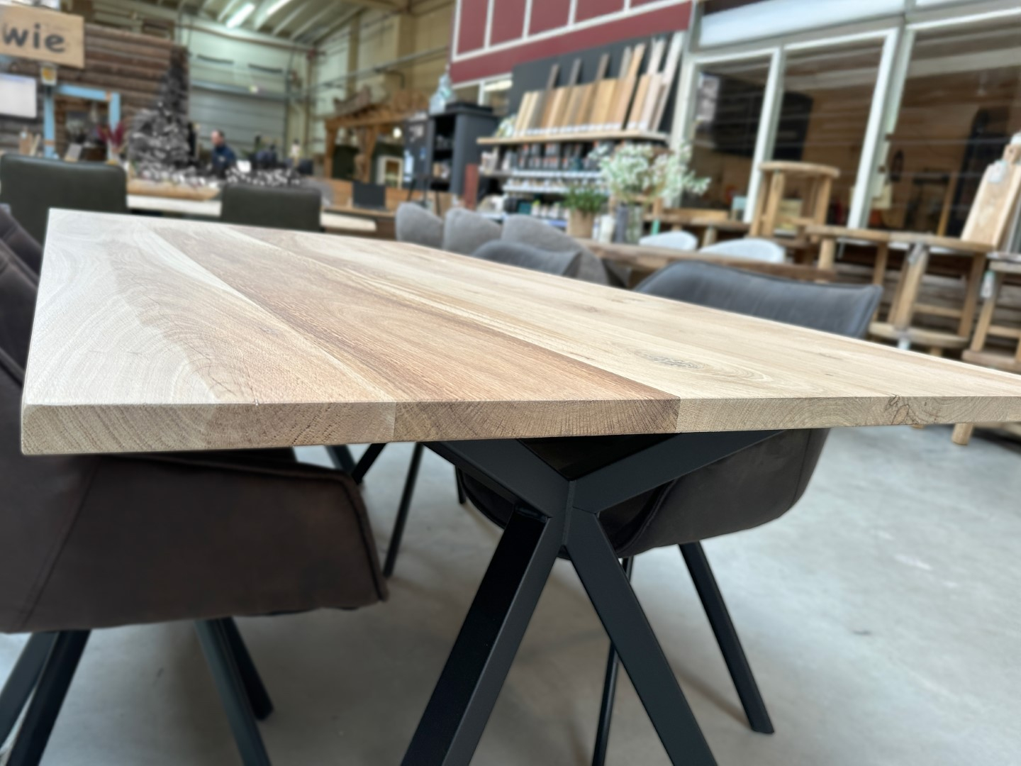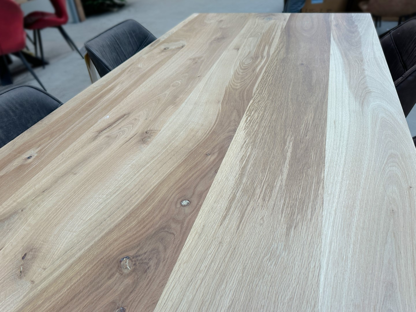 Massief eiken tafelblad 28mm dik met rechte zijkanten. Deze bladen hebben een luxe uitstraling door de extra brede eiken lamellen.